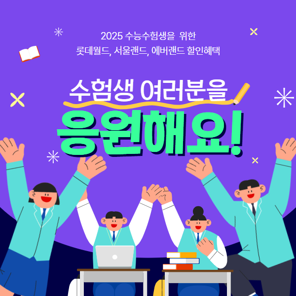 2025년 수험생 여러분 진심으로 고생 많으셨습니다! 조금만 참으면 행복한 날들이 기다리고 있답니다! 2025학년도 대학수학능력평가를 마친 여러분께 힘내시라고 다양한 혜택들을 알려드릴려고합니다. 열심히 공부한자! 테마파크 놀이동산으로 뛰어가 보자구요! 수능 자~알 보시고, 수능 마치고 행복한 나날을 응원합니다!