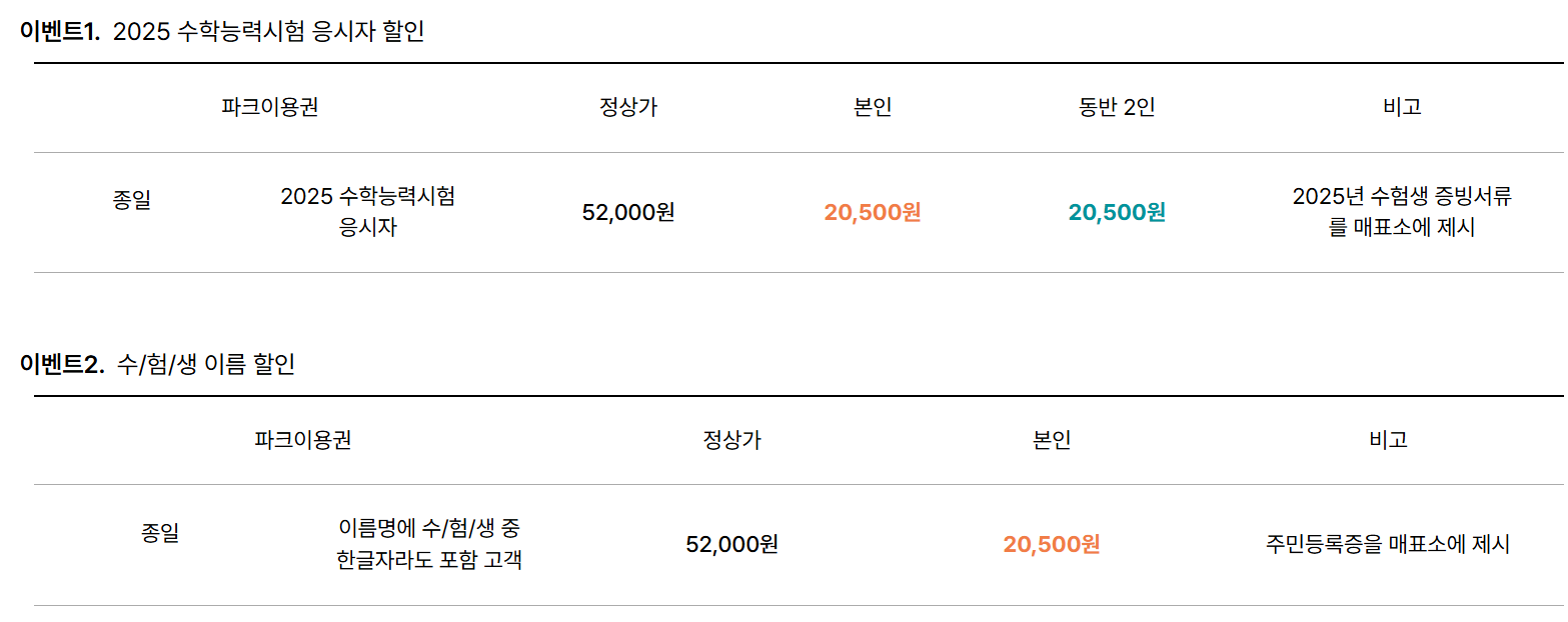 - ①매표소에서 2025 수학능력시험 응시자(수험생)임을 확인할 수 있는 수험표/접수증/수시 합격증 원본 + 신분증을 제시하셔야 적용됩니다.